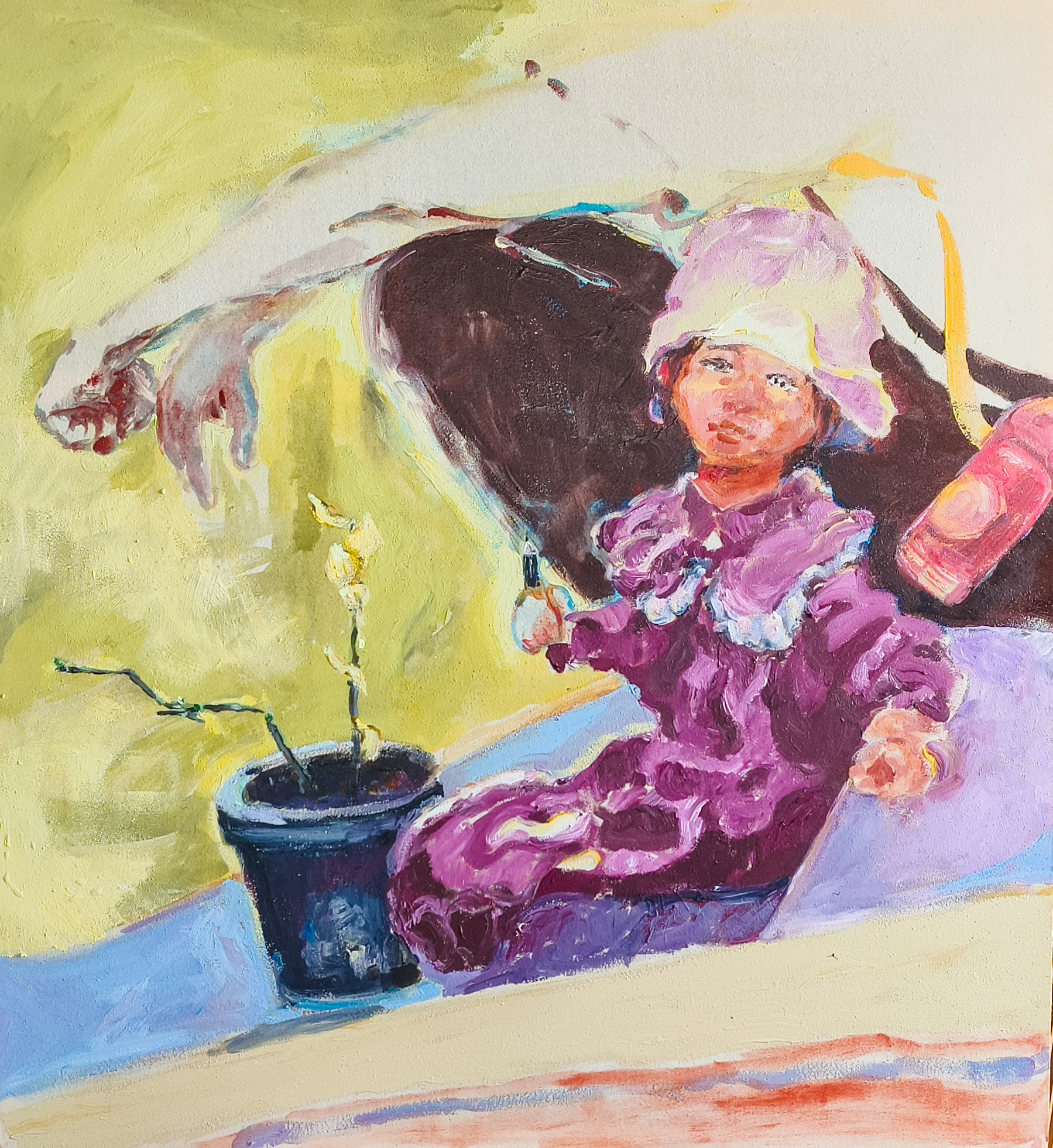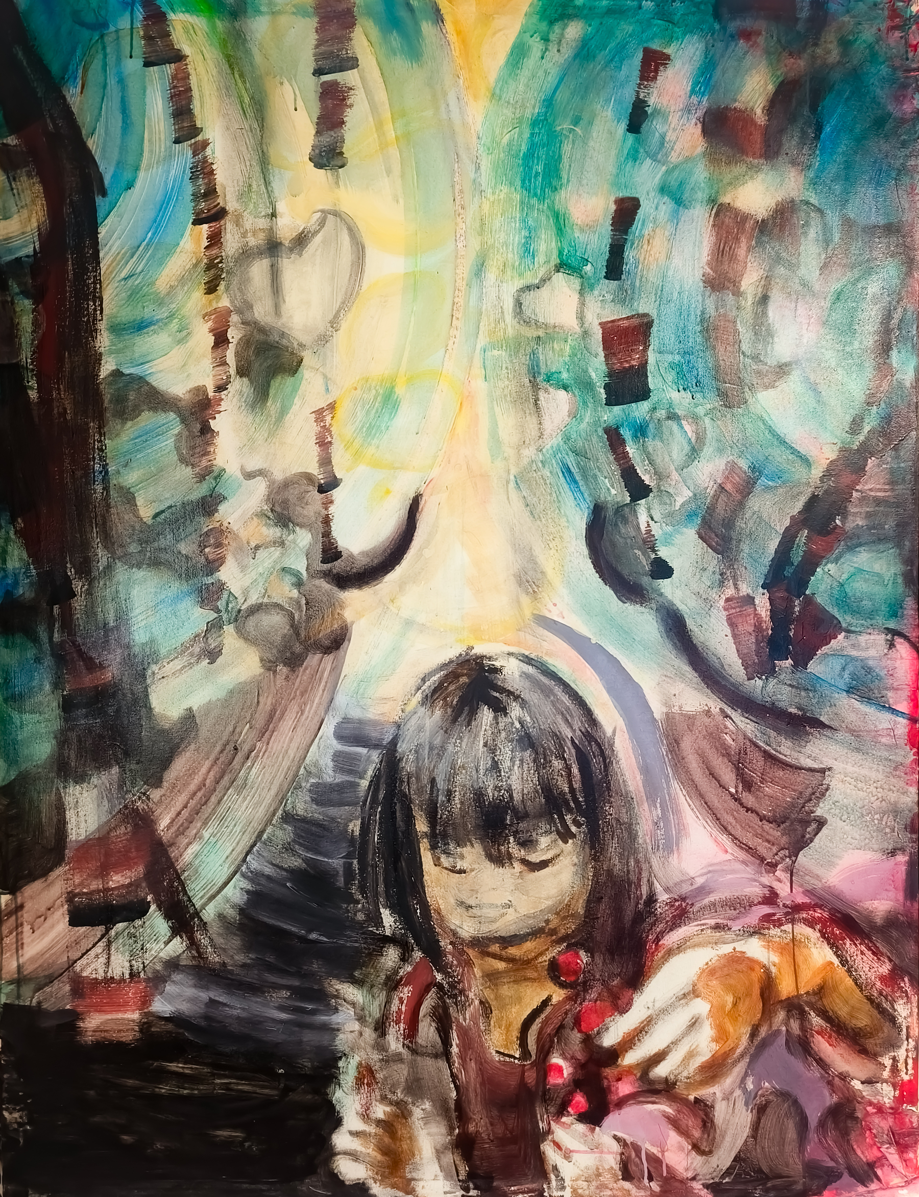 Color is a kind of material. I rarely adjust colors; instead, by modulating the relationships between colors and the interplay between pigment and canvas material, I allow color to realize the psychological effect present at the moment of caring behavior: contemplative, quiet, dazzling.