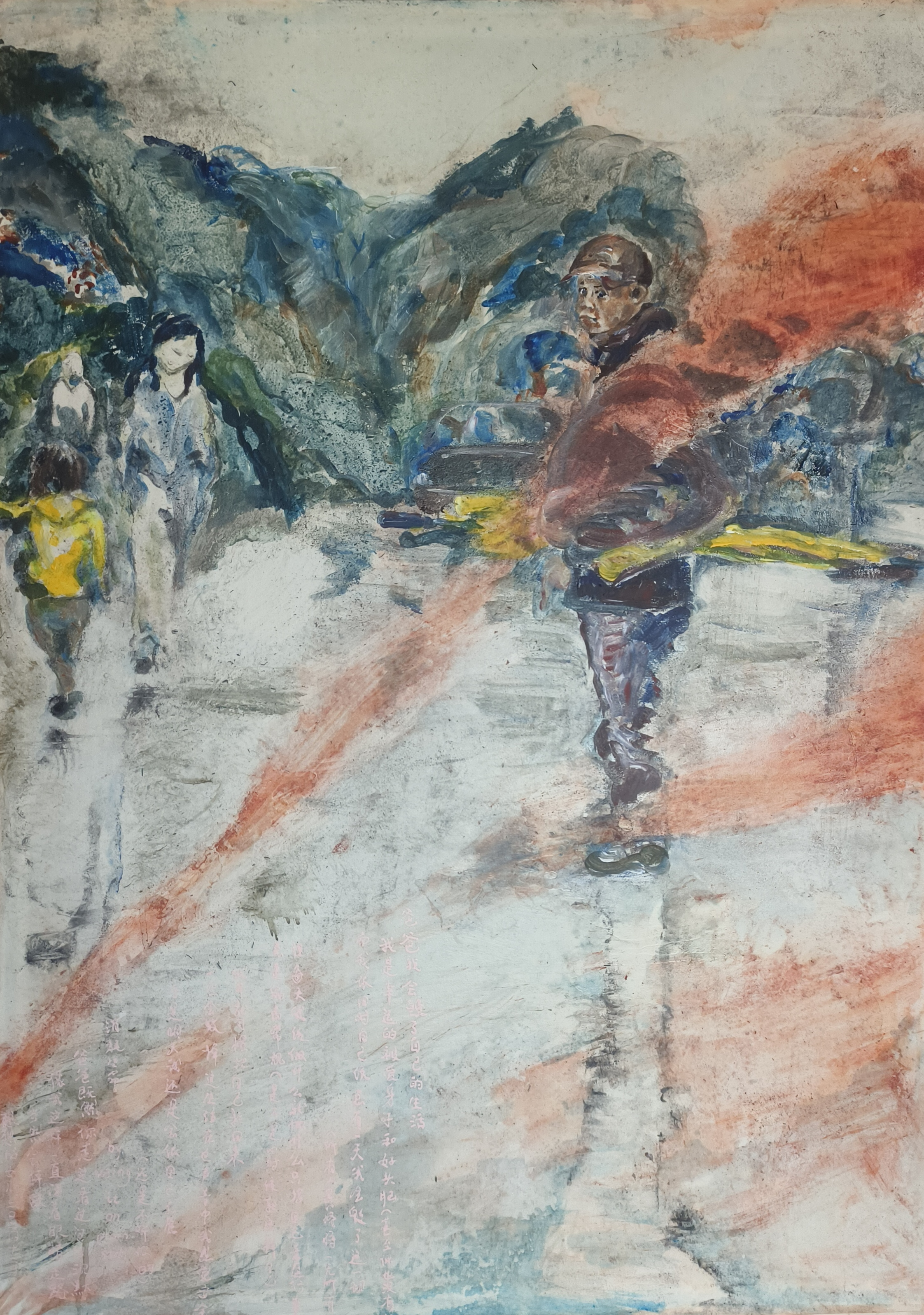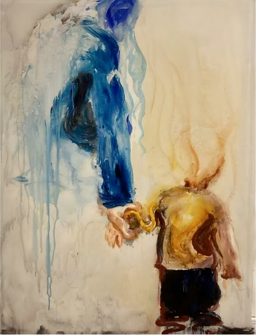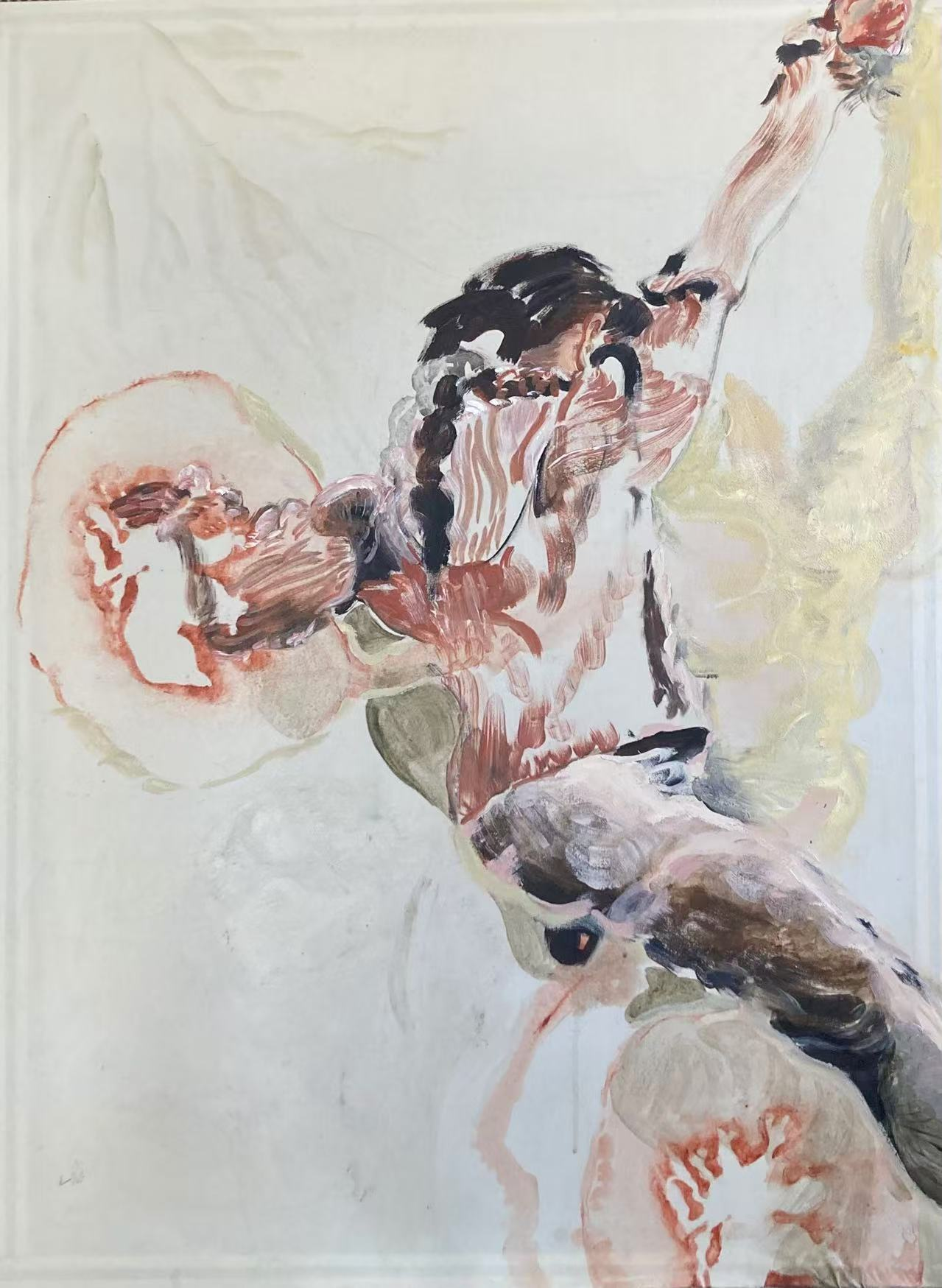 I am captivated by the moments when consciousness is deeply entwined with the body, informed by personal memories, literary research, and written narratives, delving into themes of balance, support, and symbiosis within these paintings.
